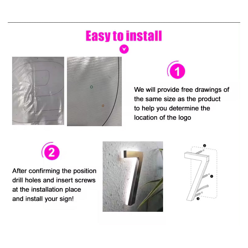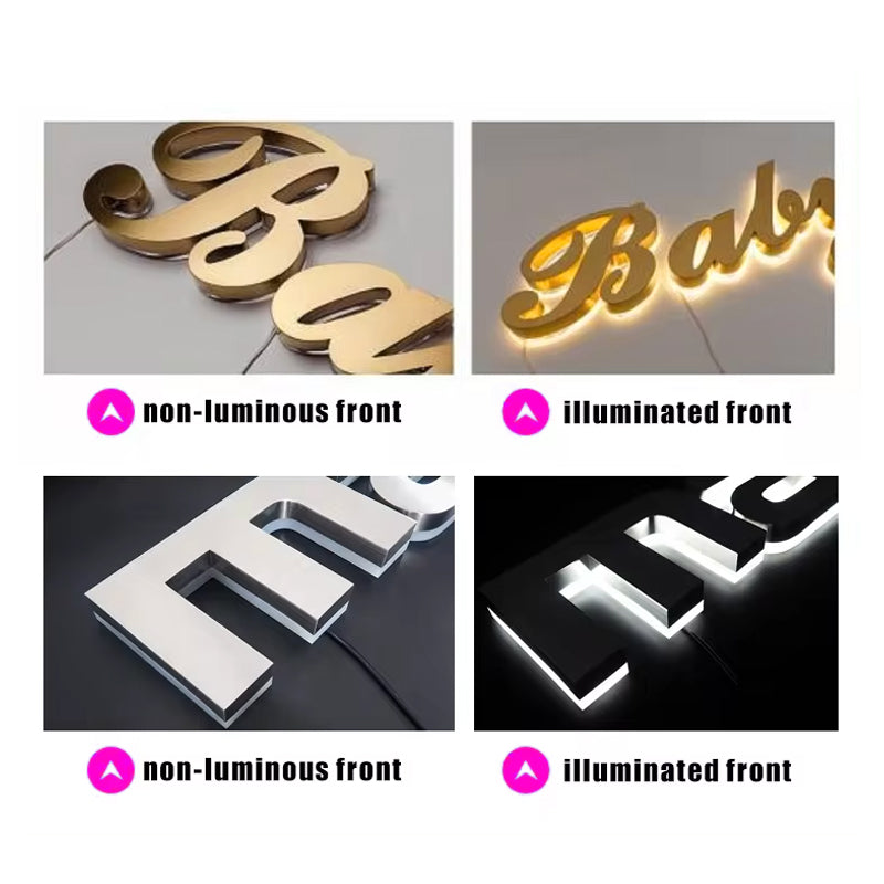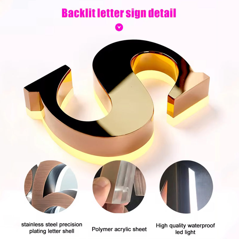 Our Custom 3D Metal Backlit Letter Signs are crafted from energy-saving materials, ensuring they are environmentally friendly, have low power consumption, and are both durable and visually appealing. Made from high-quality stainless steel, these signs are rust-proof and wear-resistant, maximizing their service life. The personalized custom logo signs feature an acrylic backing and energy-saving LED lights, providing a decorative embellishment to your space.