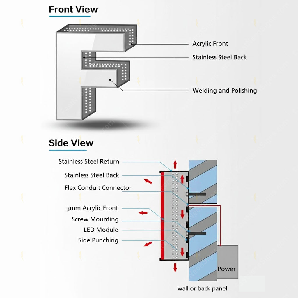Elevate your business's presence with our Custom 3D Metal Front Lit Letter Signs, a perfect blend of modern design and robust functionality. Crafted from high-quality metal, these signs are designed to withstand the test of time and the elements, ensuring your brand remains vibrant and attractive. Available in a variety of finishes, including brushed, polished, and painted, our signs offer a sophisticated look that can be tailored to match your brand’s unique style and color palette.