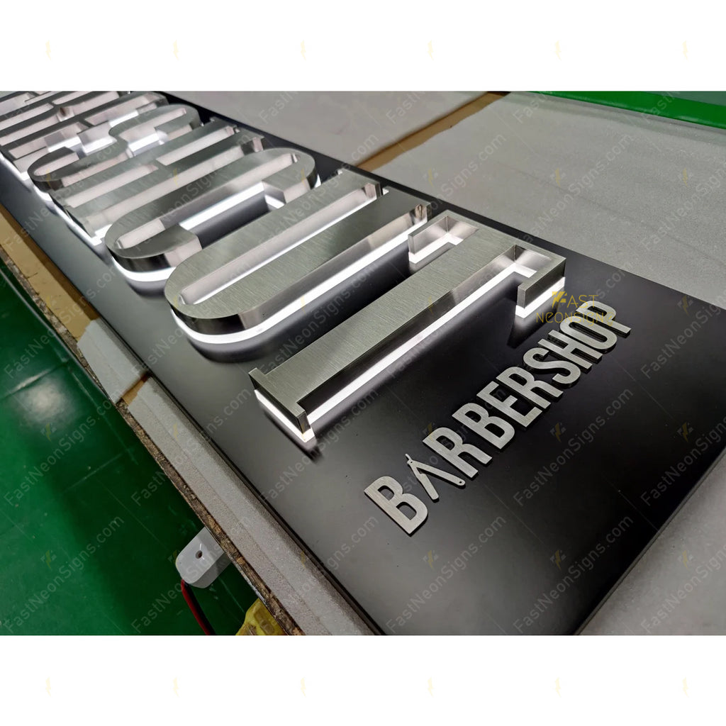 Upgrade your business, interior, beauty shop, salon, or storefront with a custom 3D metal backlit sign. Made with stainless steel, this sign features gold and silver lettering to add a touch of sophistication and elegance. Showcase your brand with a professional and eye-catching sign.